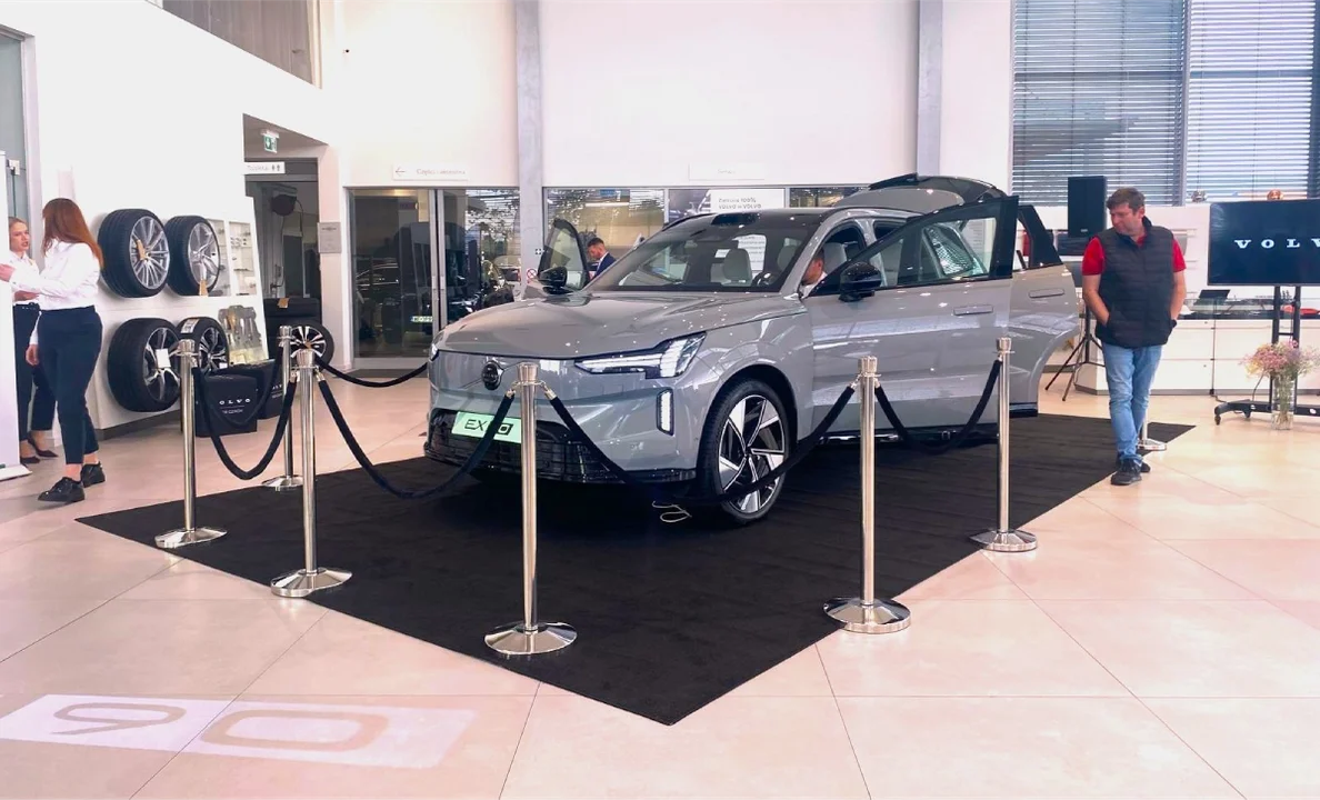 Znajdujemy się w salonie Volvo w Rudnej Małej, dealer Volvo D&R Czach. Dziś mamy okazję zobaczyć nowy model Volvo, jakim jest najnowszy model elektryczny EX90. W centralnym punkcie naszego salonu mamy model EX90. Jest to największy SUV. Obok, stoją również elektryczne, można powiedzieć młodsi bracia, modele EX30 i są one najmniejszymi elektrycznymi modelami Volvo