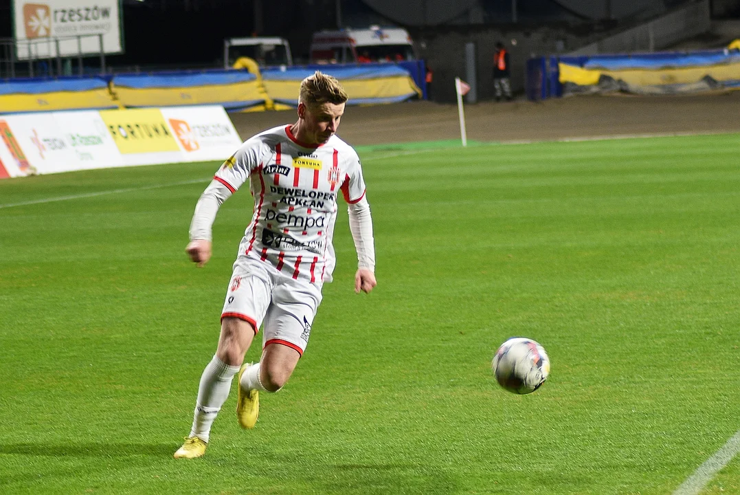 Lepiej w sobotni mecz weszli goście z Warszawy, którzy już w 19. minucie wyszli na prowadzenie. Bramkę po niefrasobliwym wybiciu piłki przez rzeszowskich obrońców silnym strzałem zdobył Marcin Kluska. Gospodarze szybko wzięli się w garść i już w 23. minucie wydawało się, że zremisują. I faktycznie po kilkudziesięciometrowym rajdzie piłkę do siatki „Czarnych Koszul” wpakował Rafał Mikulec, jednak po interwencji VAR-u okazało się, że zawodnik „Pasiaków” był na pozycji spalonej.