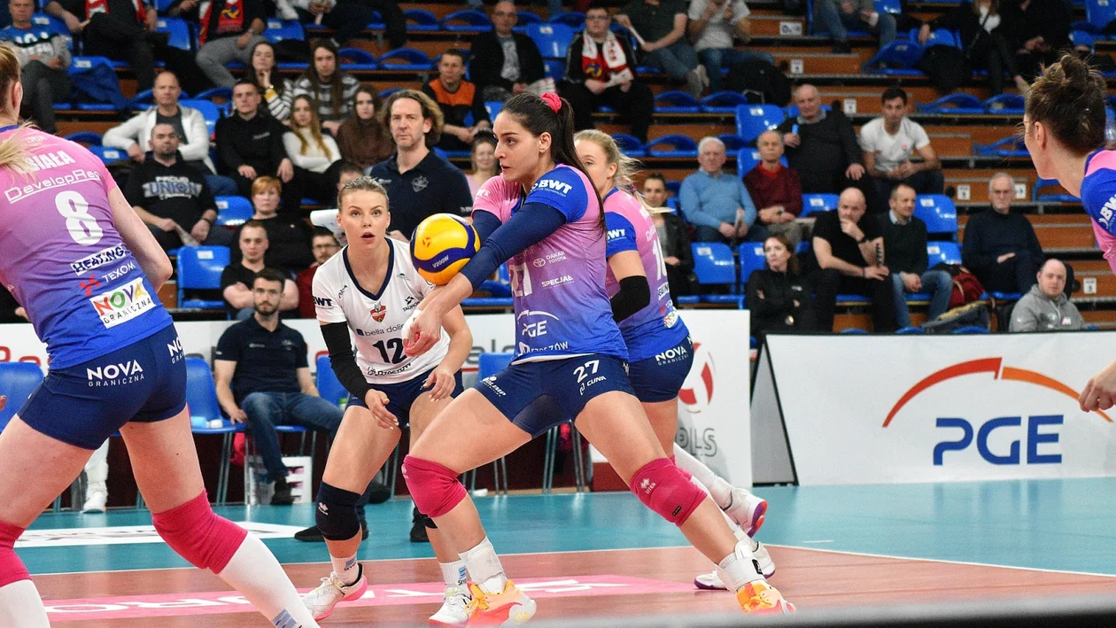 Jeszcze w pierwszym secie wydawało się, że zawodniczki z Wrocławia będą w stanie nawiązać równą walkę z faworytkami. I rzeczywiście tak było, kiedy jeszcze prowadziły 18:17. Wtedy rzeszowianki włączyły drugi bieg i zdobyły pięć punktów z rzędu, głównie za sprawą świetnie dysponowanej na tym etapie spotkania Ann Kalandadze. Set zakończył się wynikiem 20:25 po asie serwisowym Katarzyny Wenerskiej.