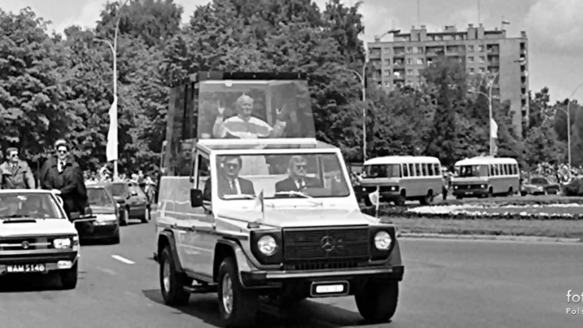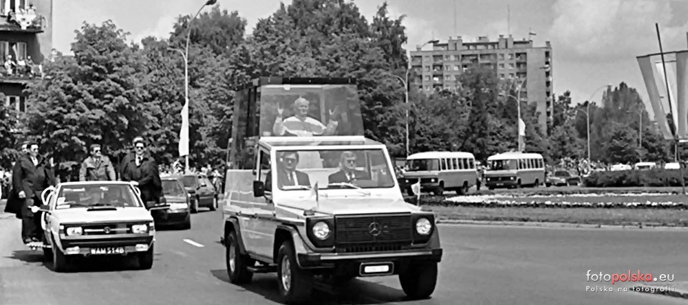 Jan Paweł II w drodze do Katedry Rzeszowskiej przejeżdżający przez centrum Rzeszowa. Źródło: FotoPolskaEu/Facebook.com