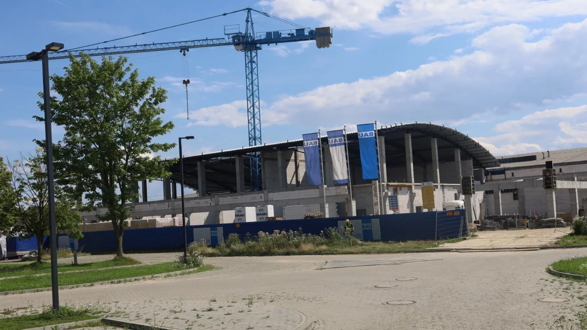 Na placu budowy Podkarpackiego Centrum Sportu Akademickiego widać już zaawansowane prace konstrukcyjne. Gotowa jest główna bryła obiektu wraz z imponującym, częściowo pokrytym dachem. Trwają roboty murowe oraz przygotowania do montażu instalacji i wykończeń wewnętrznych. Wokół hali zgromadzono materiały budowlane, co świadczy o intensywnym tempie realizacji inwestycji. Zakończenie budowy planowane jest na czerwiec 2026 roku.