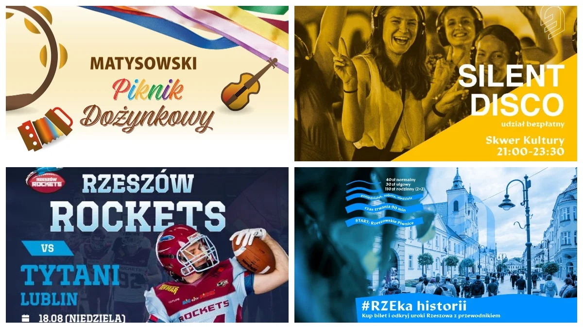 W sobotę będziemy się bawić przy Silent Disco na Skwerze Kultury. Parkiet tętnić będzie energią, a muzyka płynąć będzie bezpośrednio do słuchawek każdego uczestnika. Sportowe emocje dostarczą piłkarze Stali Rzeszów, którzy podejmą u siebie Wartę Poznań, która niedawno pożegnała się z Ekstraklasą.