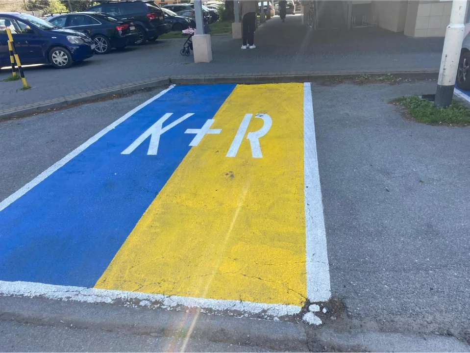 Literami K+R, na żółto-niebieskim tle, oznaczono dwa miejsca parkingowe, przed pawilonem handlowym na osiedlu Pułaskiego. To skrót od słów "kiss and ride", czyli "pocałuj i jedź". Na takich miejscach można więc zatrzymać się tylko na chwilkę (1-2min.), np. wysadzając pasażera, po czym zaraz należy odjechać. Trochę niefortunna jest kolorystyka tych miejsc, kojarząca się z ukraińską flagą. Przez to wielu mieszkańców osiedla sądzi, że przeznaczone one są tylko dla Ukraińców, co nie jest, oczywiście, prawdą