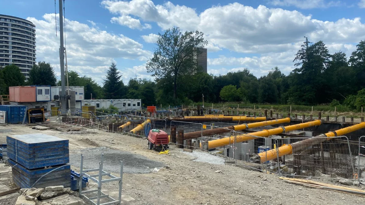 Prace przy realizacji nowej inwestycji mieszkaniowej spółki Dzielnica Parkowa postępują dynamicznie. Obecnie trwają zaawansowane roboty ziemne i żelbetowe – wykop pod przyszły budynek został już wzmocniony stalowymi podporami, a na dnie przygotowywana jest zbrojona płyta fundamentowa. Na placu budowy widoczne są również żółte stalowe rozpory stabilizujące wykop, co świadczy o starannej organizacji prac i dbałości o bezpieczeństwo. Obok trwających prac fundamentowych, zgromadzono już znaczną ilość materiałów budowlanych, co sugeruje, że wkrótce ruszy wznoszenie kondygnacji nadziemnych. Całość realizowana jest w otoczeniu nowoczesnej zabudowy mieszkaniowej, co podkreśla intensywny rozwój tej części miasta.