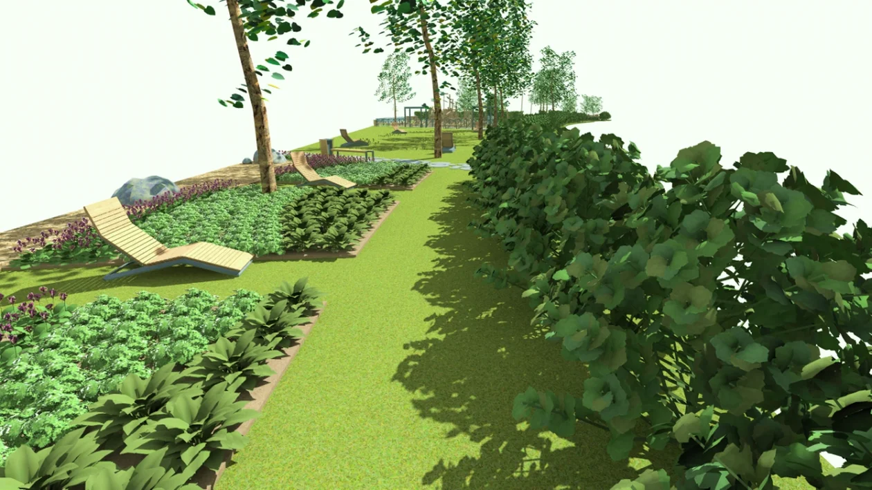 W centralnej części strefy zostanie wybudowany plac zabaw, który będzie wyposażony w urządzenia zabawowe oraz żagle zacieniające. Nawierzchnia tej części będzie wykonana z drewnianych zrębków. W zachodniej części terenu znajdziecie strefę relaksu, w której zostaną ustawione parklety, a przy nich posadzona zostaną wysokie rośliny. We wszystkich częściach inwestycji powstaną rabaty, na których wyrosną specjalnie wyselekcjonowane gatunki ziół. Tuż przy nich ustawione zostaną ławki i leżaki.