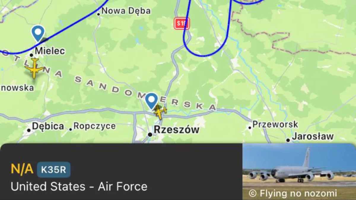 Za pomocą aplikacji "Flight Radar" można śledzić wojskowy samolot Boeing KC-135T Stratotanker, należący do sił powietrznych USA, który szybuje nad obszarami województw Lubelskiego i Podkarpackiego.