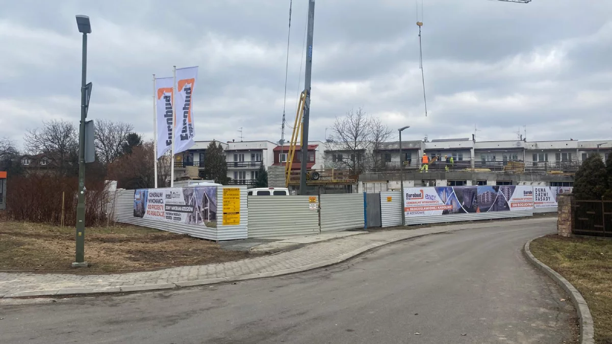 Przy alei Krzyżanowskiego w Rzeszowie trwają intensywne prace budowlane. Na placu budowy widoczny jest już szkielet nowego obiektu, a robotnicy zajmują się montażem kolejnych elementów konstrukcji. Dźwig pracuje nad transportem materiałów, a teren inwestycji został ogrodzony i zabezpieczony banerami informacyjnymi. Widać również betonowe ściany i zbrojenia, co sugeruje, że budynek znajduje się w początkowej fazie wznoszenia.