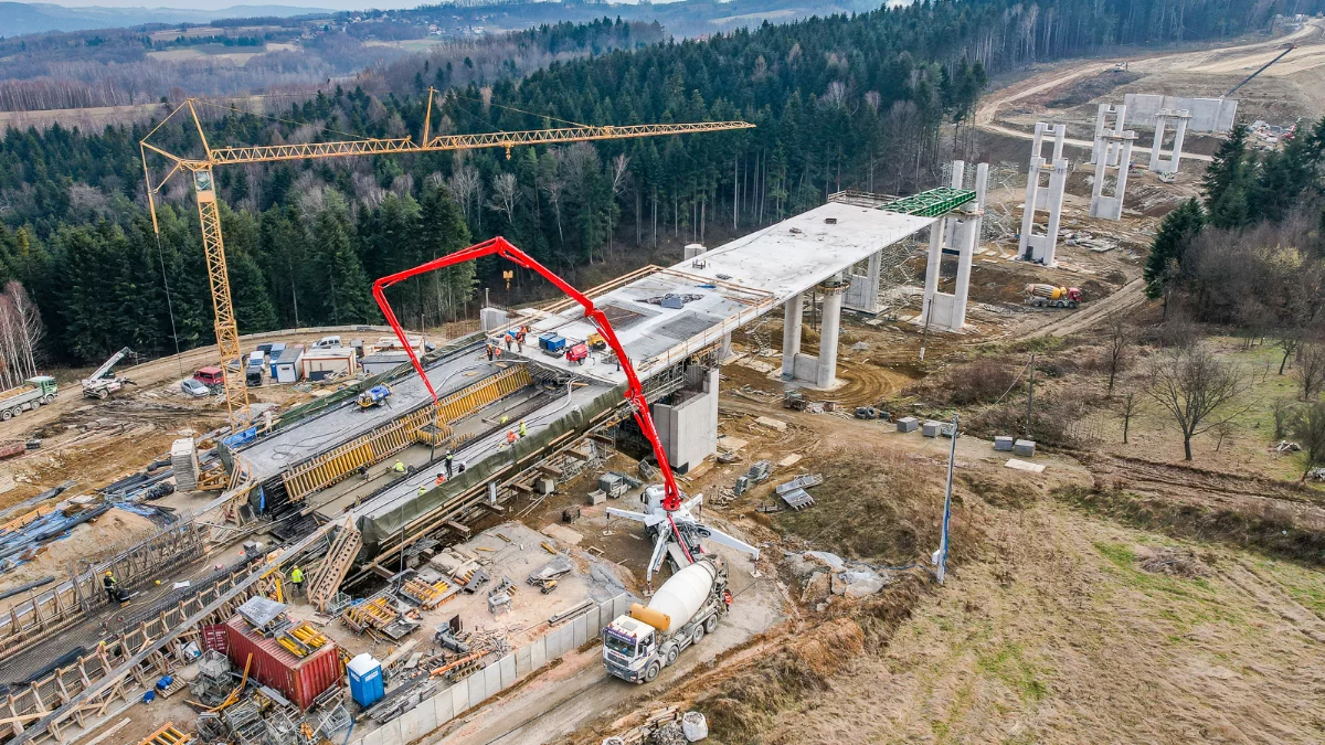 Jednym z ciekawych obiektów na budowanej drodze jest estakada w Połomii, gdzie w zeszłym tygodniu kontynuowano roboty z zakresu betonowania. Obiekt wykonywany jest w technologii nasuwania podłużnego. Trzeci segment został już wybetonowany i nasunięty. Aktualnie zbrojona jest płyta czwartego i piątego segmentu. Estakada posiada już wybetonowane wszystkie podpory. Stan zaawansowania prac przy budowie tej konstrukcji wynosi ok. 50 procent