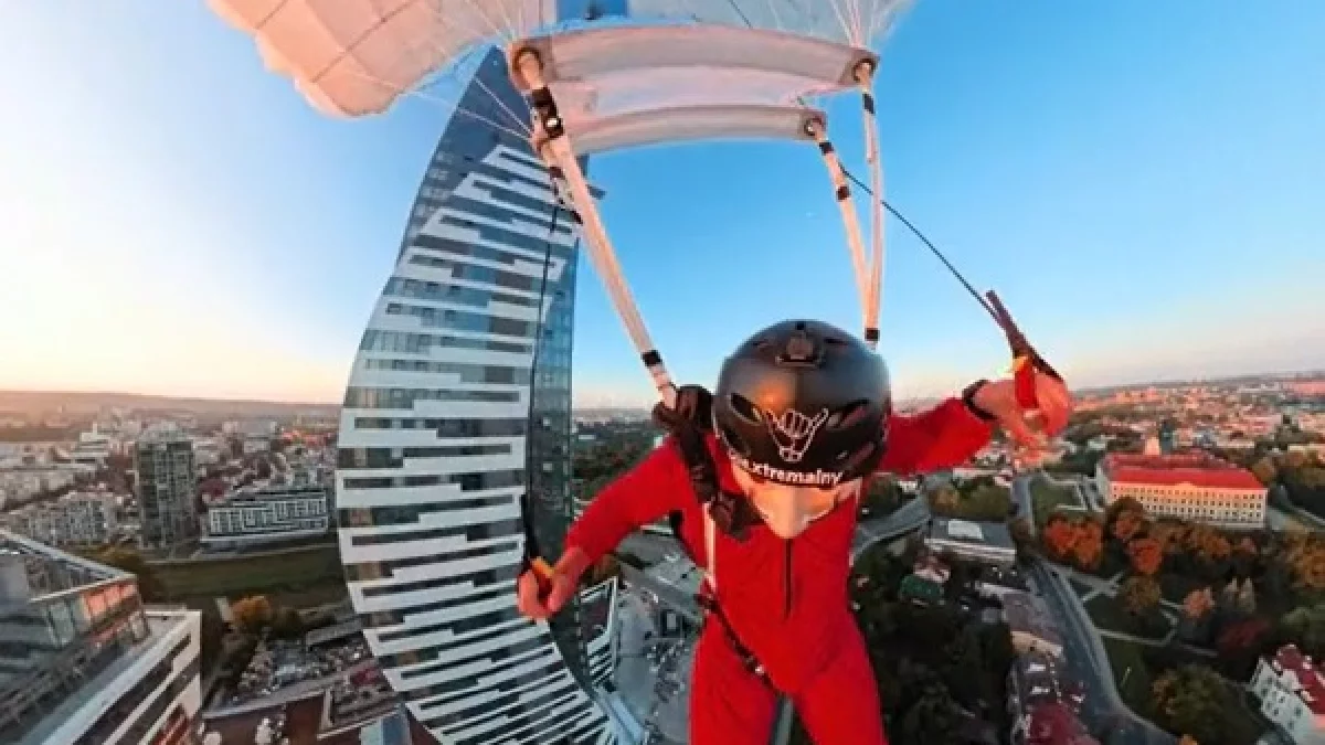 Takich wyczynów absolutnie nie zalecamy powtarzać, jeśli nie jesteśmy do tego odpowiednio przeszkoleni. Autor nagrania to profesjonalista, co widać na załączonym filmie. Zeskoczył on z najwyższego wieżowca i wylądował na trawniku przy Filharmonii Podkarpackiej.