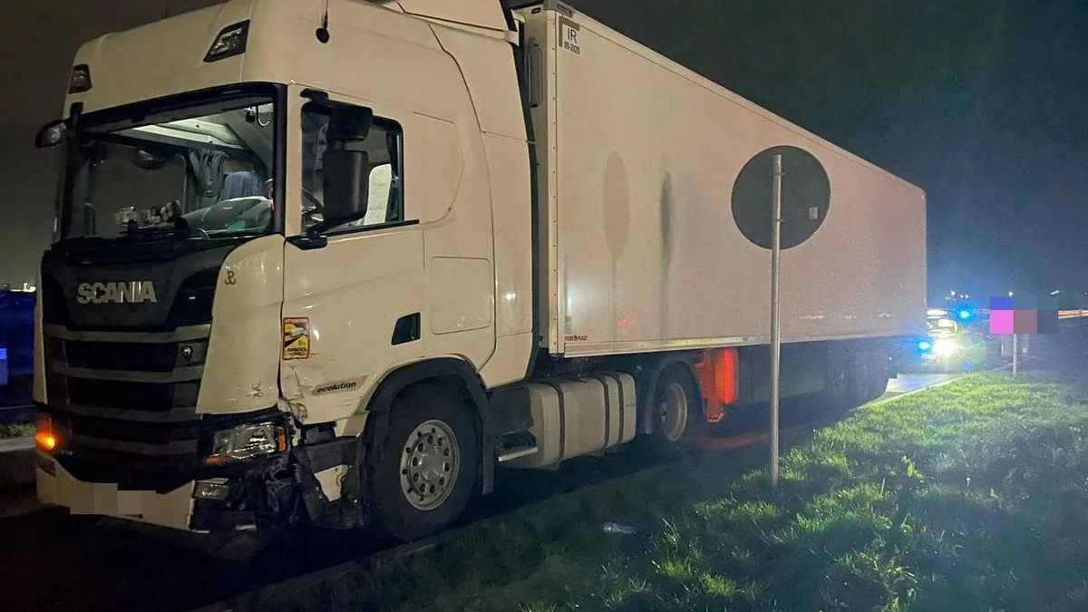 Funkcjonariusze ujawnili, że na kabinie dostawczej Scanii obecne są uszkodzenia, które sugerują, że tir brał udział w wypadku.