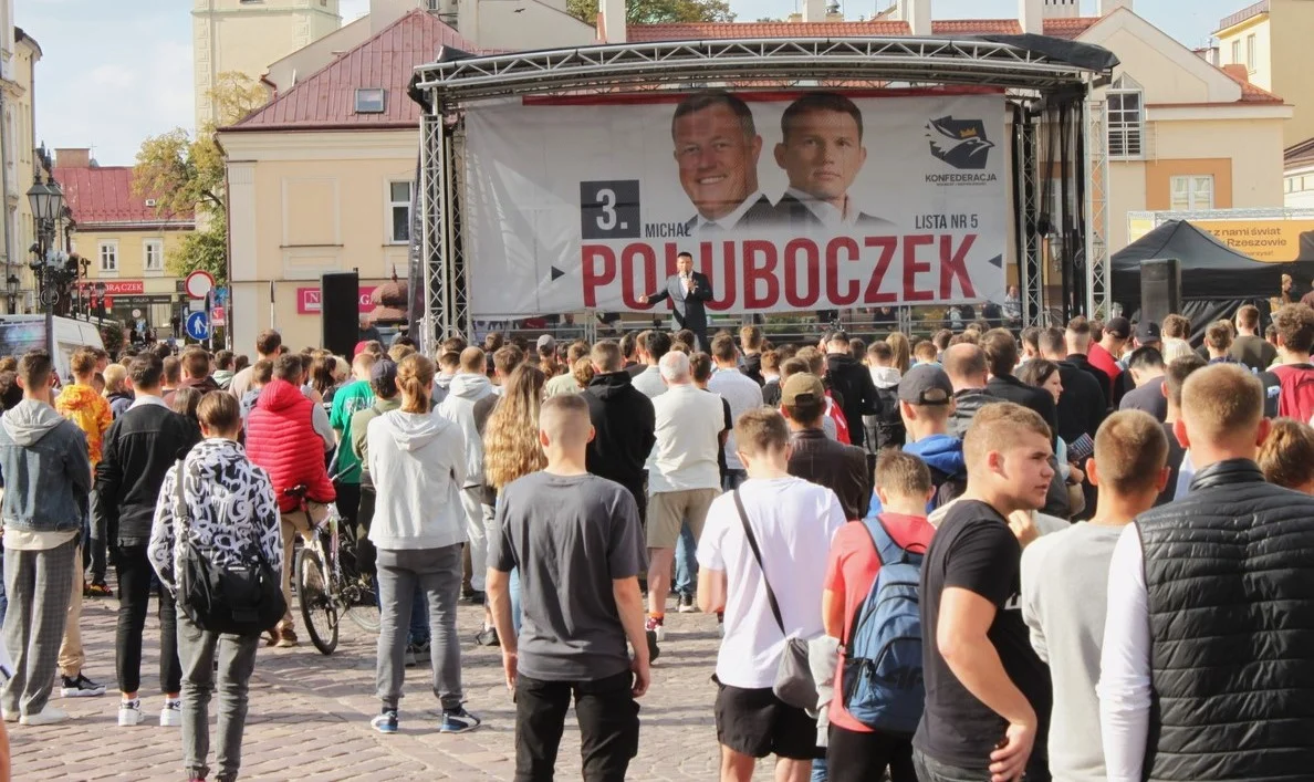 Sławomir Mentzen o godzinie 12:30 w piątkowe południe pojawił się na scenie rzeszowskiego Rynku. W asyście swojego człowieka, trzeciego na liście w okręgu rzeszowsko-tarnobrzeskim, Michała Połuboczka, skomentował bieżące sprawy polityczne i zachęcił do głosowania na Konfederację Wolność i Niepodległość.