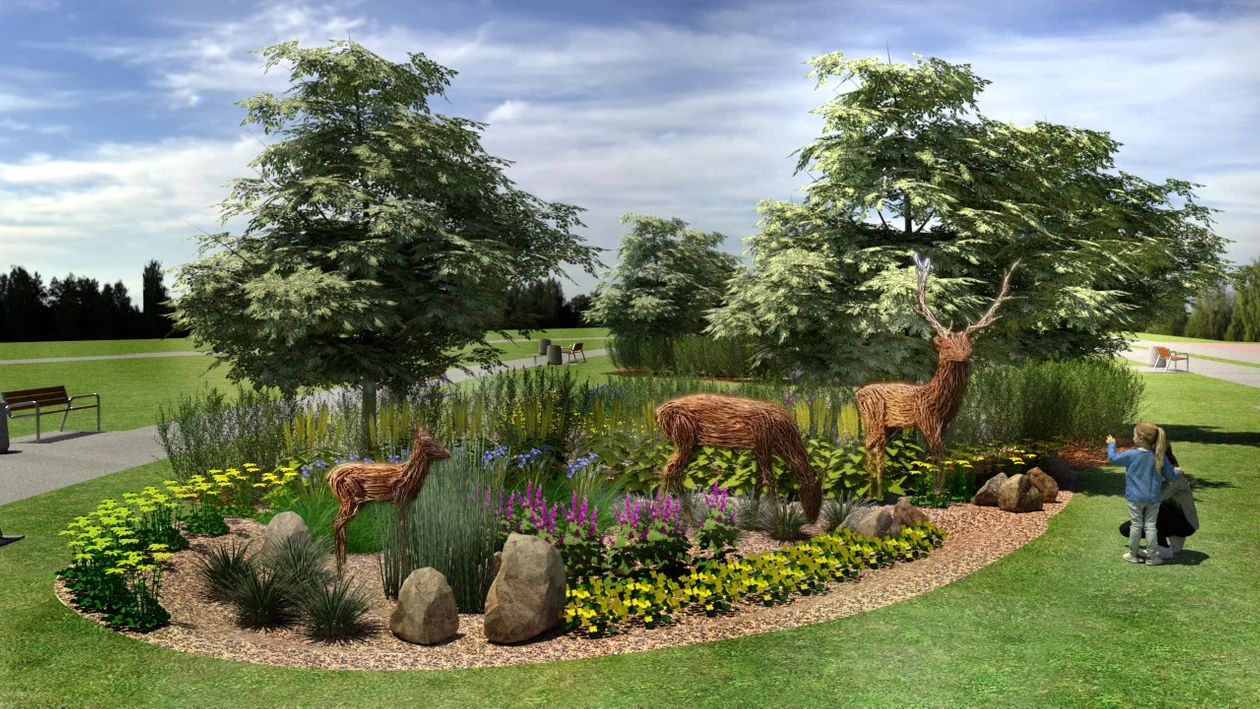 Ponadto ogród zostanie upiększony mała architekturą i proekologicznymi ozdobami – wykonanymi z wikliny ławkami, sylwetkami zwierząt i altaną oraz drewnianymi domkami dla owadów.