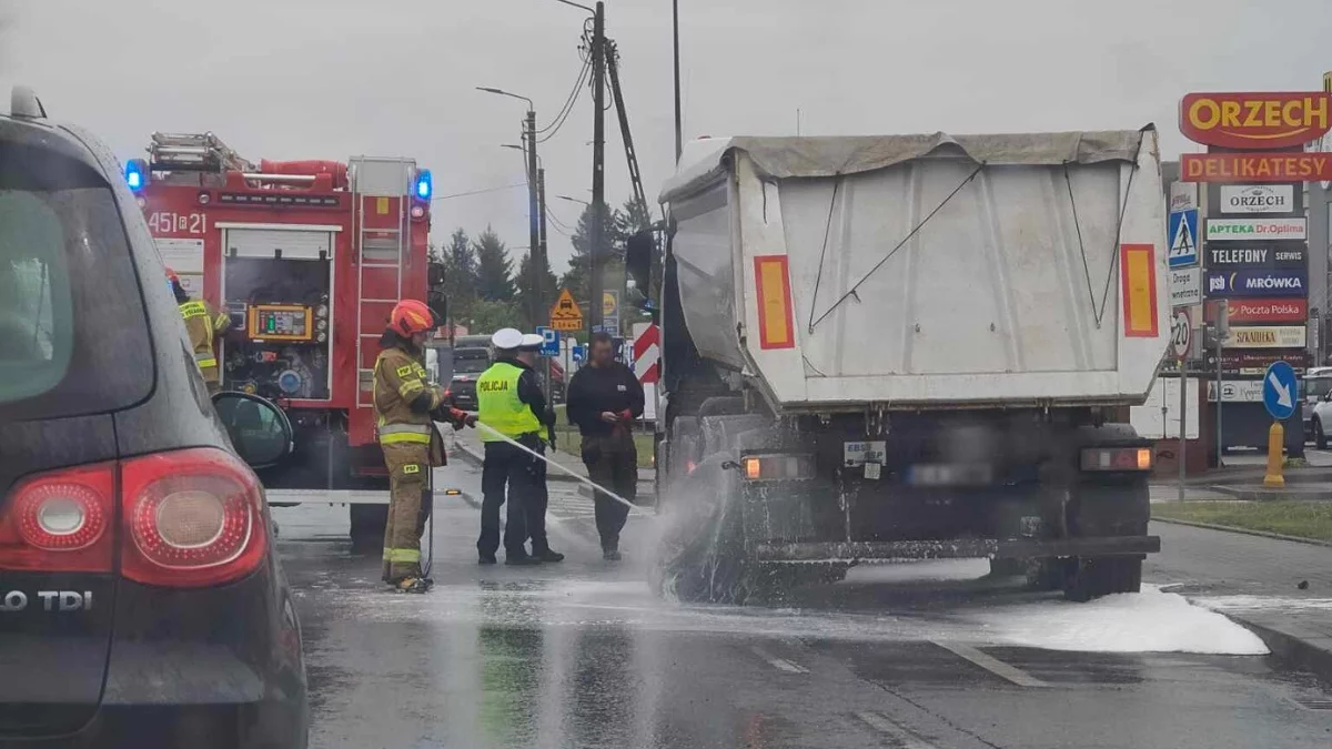 Na miejscu strażacy schładzają rozgrzaną oponę przy użyciu wody. Ruch w tym rejonie jest utrudniony - kierowcy proszeni są o zachowanie ostrożności.