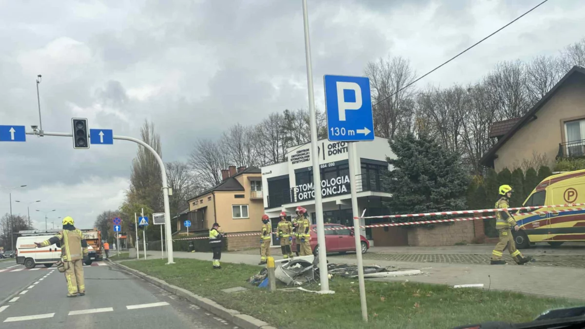 Kobieta poruszająca się samochodem osobowym uderzyła w skrzynkę elektryczną, a następnie w samochody znajdujące się na pobliskim parkingu. W wyniku zdarzenia przestała działać sygnalizacja świetlna, a kobieta kierująca pojazdem w wyniku poniesionych obrażeń została przetransportowana do szpitala.